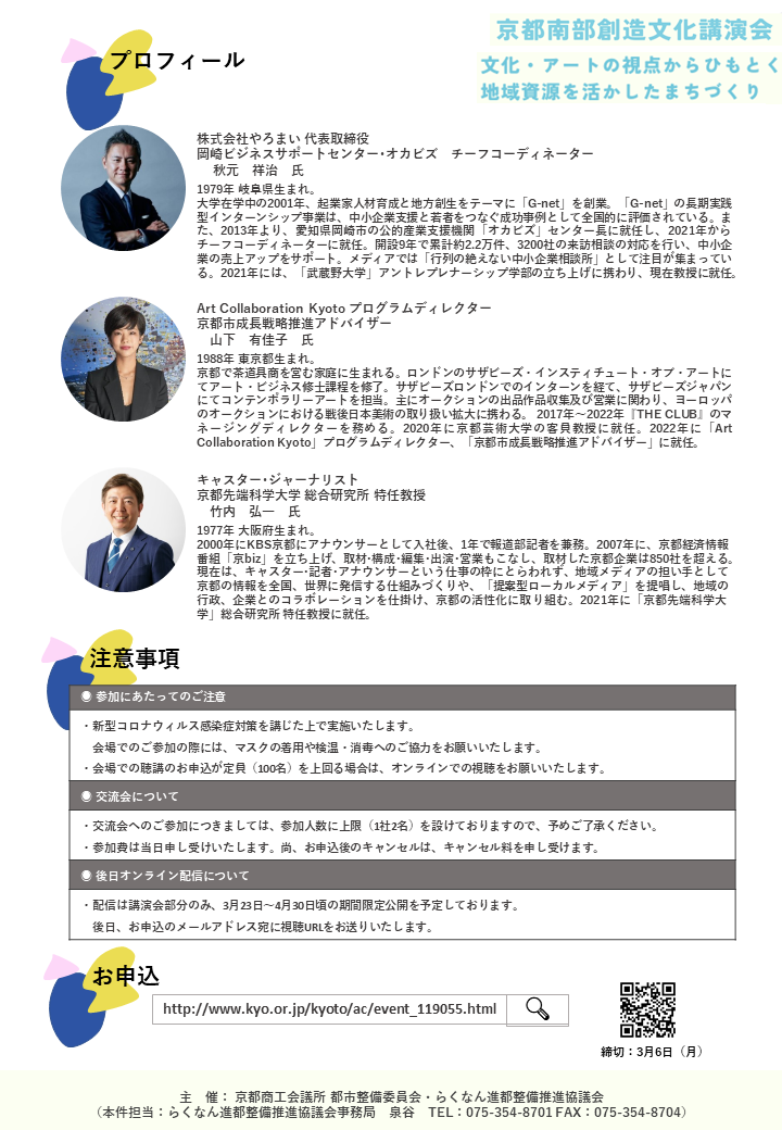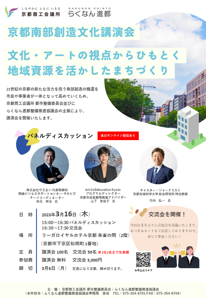 この度、京都商工会議所都市整備委員会並びにらくなん進都整備推進協議会の共催により、講演会を開催致したく存じます。