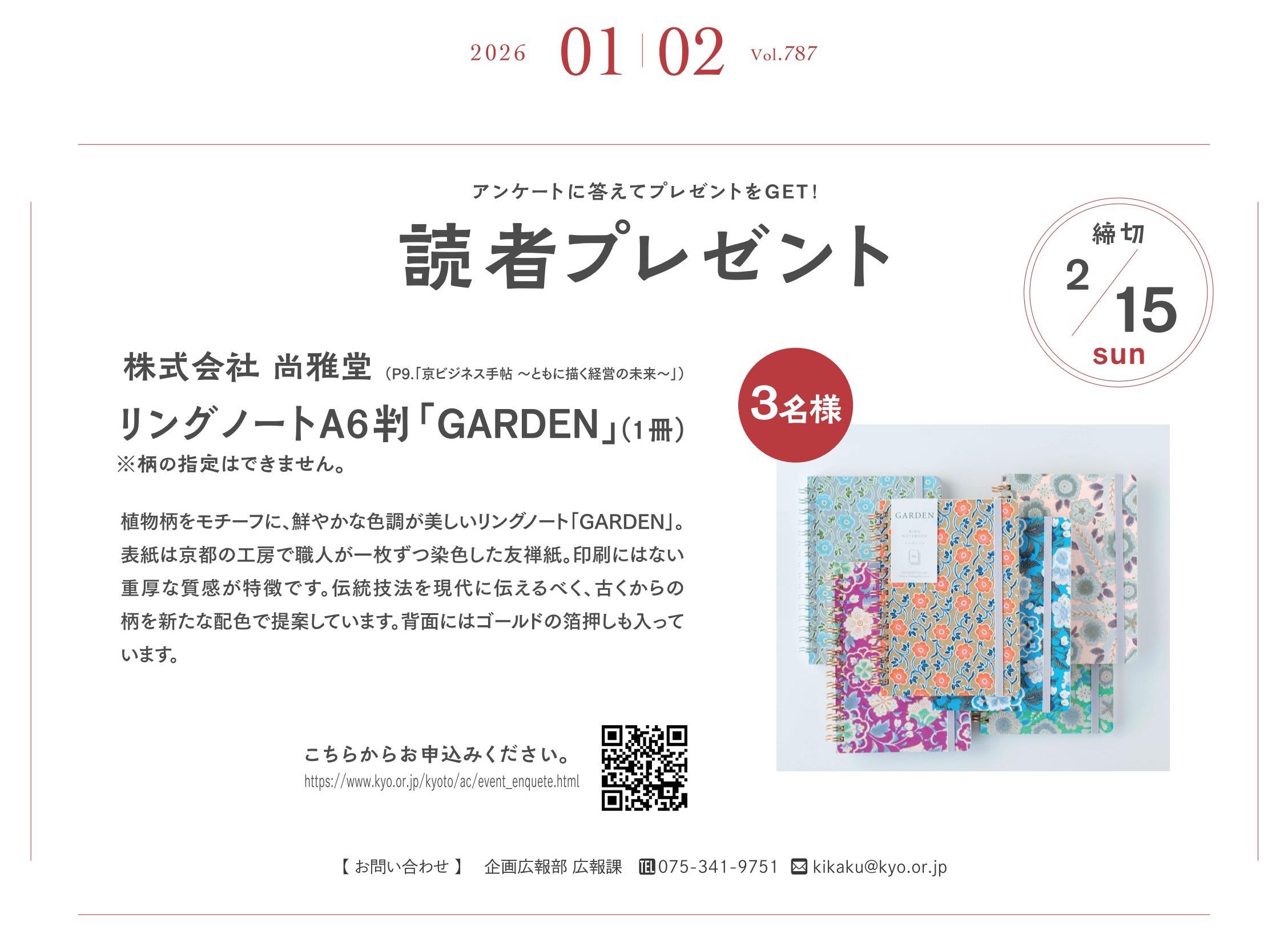 Tweet 会報誌「京BUSINESS REVIEW 2026年1・2月号」読者アンケート受付中〔株式会社 尚雅堂/リングノートA6判「GARDEN」(1冊)〕 読者プレゼントが抽選で当たります!誌面づくりの参考にさせていただきますので、アンケートにご協力をお願いいたします。 アンケート回答はこちら
